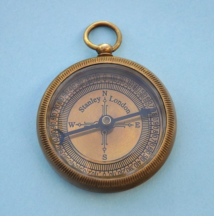 The face of the compass rose is marked "Stanley London" and the compass card is protected by a beveled glass cover.  The top of the solid brass compass housing features a knurled periphery and a sturdy fob so that a compass chain may be attached.  The back of the antique compass is blank and can be custom engraved with a personalized message of up to 14 words.