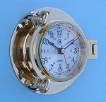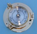 Medium Size Ship's Barometer $199 We also offer two sizes of non-chiming ship's clocks and barometers. These German-made ship's clocks and barometers can either be purchased separately or as matched sets and come with a one year warranty. Both sizes of barometers feature precision German aneroid movements that are calibrated up to 3500 feet above sea level, and both clocks have extremely accurate battery operated Japanese quartz movements with sweep second hands (require standard AA battery not included). Both sizes of barometers have an adjustable reference pointer that can be set to the previous barometric reading to indicate if the atmospheric pressure is rising or falling. Rising barometric pressure indicates improving weather and falling pressure indicates a worsening climate. Both barometers are factory calibrated for sea level and have adjustment screws for other altitudes. All ship's clocks and barometers come complete with brass mounting screws. The medium size brass ship's clock and barometer have porthole style brass cases with hinged beveled glass covers. The medium size clock and barometer measure 5 1/2 inches (14.0 cm) in diameter, and 1 7/8 inches (4.8 cm) deep (not including screws). The medium size clock weighs 2 pounds, 5.6 ounces (1.07 kg) and the medium size barometer weighs 2 pounds, 4.8 ounces (1.04 kg). The Medium Size Solid Brass Ship's Clock is only $169 and the matching Ship's Barometer is $199. We also offer the Weems and Plath Porthole Weather Center, Weems & Plath Nautilus™ Collection Ship's Barometers and Clocks, the less expensive Weems & Plath Trident Time and Tide Wall Clock, and the brass Weems & Plath Endurance 125 Time and Tide Wall Clock. |