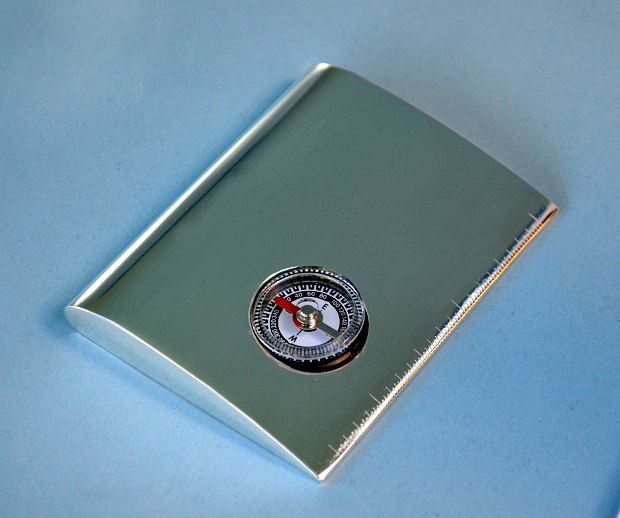 A working liquid damped compass is mounted on top of this solid metal paperweight.