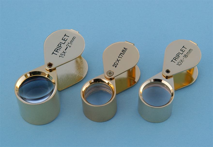We offer three high quality Folding Pocket Magnifiers and Eye Loupes.  All three models feature all-metal magnifier bodies with a gold plating to eliminate tarnishing, and precision optical glass lenses.  Many all-plastic magnifiers sell for the same price as these high quality all-metal magnifiers with precision ground glass lenses.  All three magnifiers allow detailed examination of jewelry, stamps, coins, and everyday items.  They can be used as powerful handheld magnifiers, or held close to the eye for use as a powerful eye loupe.  A lanyard or key chain can be easily connected to the fittings on the magnifiers.