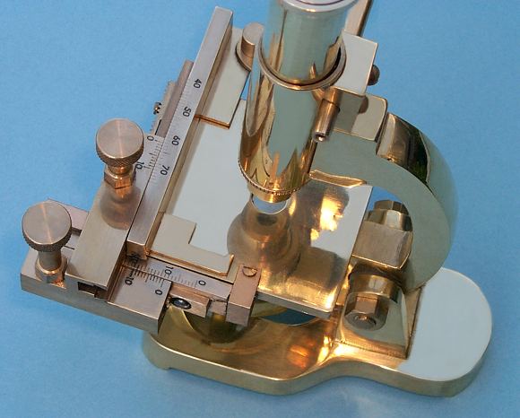 This beautiful solid brass microscope has a precision X-Y translation stage