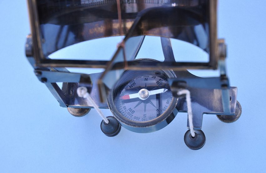 This Stanley London® sundial is an antique reproduction of a universal equinoctial sundial with leveling pendulums and internal magnetic compass.